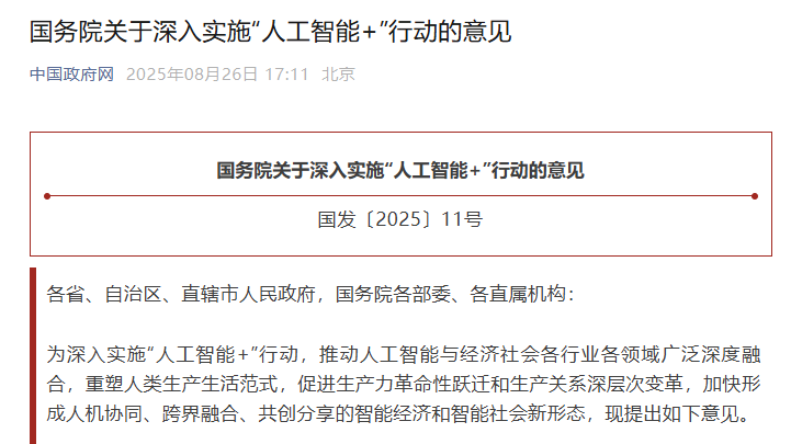 国务院关于深入实施“人工智能+”行动的意见国发〔2025〕11号各省、自治区、直辖市人民政府,国务院各部委、各直属机构:为深入实施“人工智能+”行动,推动人工智